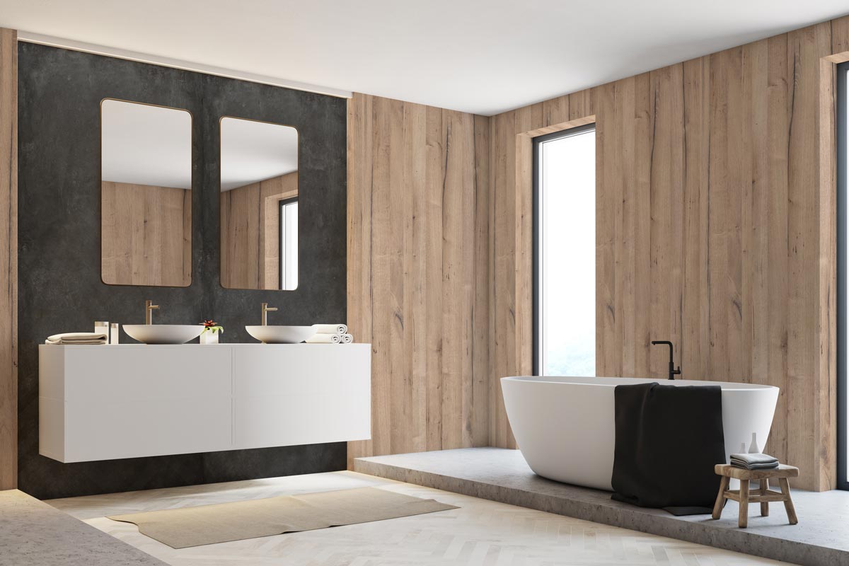Ein fugenloses Bad wird ohne Wand- und Bodenfliesen gestaltet. Stattdessen kommen unsere Aluminium-Verbundplatten zum Einsatz und sorgen nicht nur optisch für die Revolution im Bad. Durch den Einsatz der großflächigen Wandverkleidungen sparen Sie Fugen und Zeit – bei der Montage und bei der Pflege.
